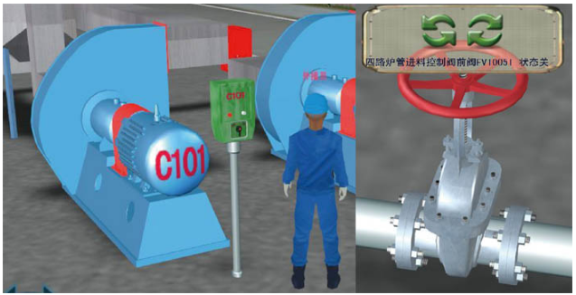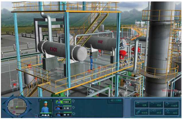 按實(shí)際現(xiàn)場設(shè)備的外形、尺寸、顏色、位置關(guān)系及距離、管線連接方式、音響效果等物理屬性建立3D場景和設(shè)施,包括防火堤、滅火器、消防水炮等各種安全設(shè)施。