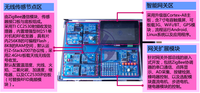平臺主要包括 ZigBee 無線傳感器節(jié)點、升級版 Cortex-A8 智能網(wǎng)關(guān)、以及網(wǎng)關(guān)擴展模塊等硬件資源。如圖所示:
