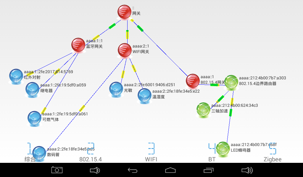 網(wǎng)關(guān)應(yīng)用軟件通過CoAP服務(wù)和串口服務(wù),將WiFi、藍牙、IEEE802.15.4、以及ZigBee感控節(jié)點數(shù)據(jù)解析處理,在網(wǎng)關(guān)的Mesh拓?fù)鋱D中實時流動地顯示傳感器數(shù)據(jù)的上、下行走向;