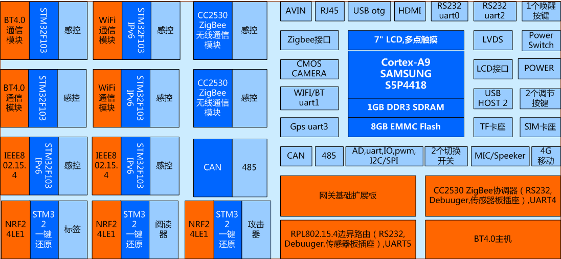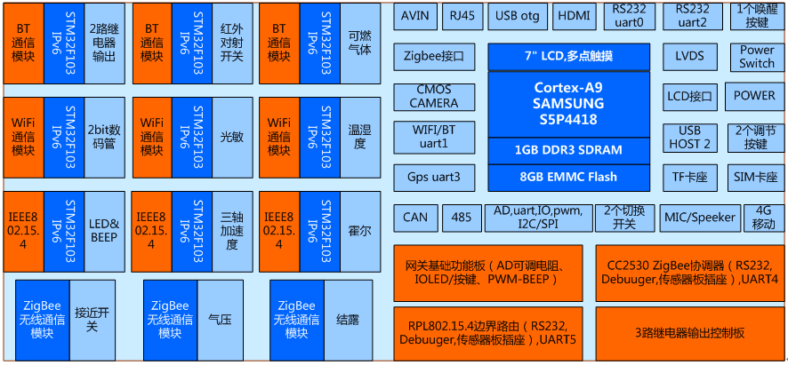一、整體要求 1)能夠滿足單片機接口及應(yīng)用、傳感器接口及應(yīng)用、無線傳感網(wǎng)、嵌入式操作系統(tǒng)開發(fā)、嵌入式Linux應(yīng)用開發(fā)、Android移動應(yīng)用開發(fā)等課程要求。 2)能夠組建藍牙、WiFi、IEEE802.15.4、ZigBee四種無線網(wǎng)絡(luò),實現(xiàn)數(shù)據(jù)的無線傳輸; 3)能夠?qū)⑺{牙、WiFi、IEEE802.15.4無線網(wǎng)絡(luò)經(jīng)IPV6協(xié)議、Zigbee節(jié)點經(jīng)ZStack協(xié)議融合在一個拓?fù)鋱D中,在界面上顯示藍牙、WiFi、RPL802.15.4、ZigBee等節(jié)點的傳感器數(shù)據(jù)或執(zhí)行器狀態(tài),并實時流動地顯示各個傳感器數(shù)據(jù)的上、下行走向; 4)要求藍牙、WiFi、IEEE802.15.4三種傳感器節(jié)點均具有唯一的IPv6地址,統(tǒng)一采用IPv6協(xié)議組包通信。 5)要求網(wǎng)關(guān)支持Linux、Android雙操作系統(tǒng),支持一鍵燒寫、一鍵切換。 6)要求在保證網(wǎng)關(guān)接入互聯(lián)網(wǎng)的前提下,能夠配置接入云服務(wù)平臺,并實現(xiàn)移動端傳感器數(shù)據(jù)的采集顯示和執(zhí)行器的遠程控制。 二、硬件資源 1.Cortex-A9網(wǎng)關(guān)(1個) 1)核心板資源: (1)CPU:Cortex-A9四核心的Samsung s5p4418,主頻1.4GHz; (2)GPU:MAIL-400,3D圖形加速 (3)內(nèi)存: 1GB DDR3; (4)EMMC: 8GB; (5)核心板+底板設(shè)計:核心板加裝屏蔽罩,郵票孔方式與底板連接,抗干擾能力更強,比插針式更穩(wěn)定可靠。要求引出核心板信號線,不少于188PIN。 2)網(wǎng)關(guān)主板資源: (1)LCD接口:7寸IPS電容屏(16:9),分辨率1024×600; (2)USB接口:2路USB_HOST 2.0輸出,1路USB OTG; (3)Ethernet接口:核心板內(nèi)置千兆IP,外加不超過3RMB的PHY芯片即可,支持10/100/1000M,RJ45接口; (4) 串口:2路3線RS232,1路TTL接口,1路RS485,1路Bluetooth; (5)CAN總線接口:1路; (6)RS485總線接口:1路; (7)HDMI 接口:HDMI1.4a,*大支持1920*1080高清數(shù)字輸出; (8)LVDS液晶屏接口:單通道,*大支持1920*1080; (9)攝像頭接口:1路CMOS并行接口,*大支持800萬像素; (10)AV接口:1路模擬視頻母口輸入; (11)外部存儲擴展接口:SD卡、TF卡接口; (12)音頻接口: 1路MIC輸入,1路1. 8w喇叭; (13)按鍵:1個復(fù)位按鍵、1個休眠喚醒按鍵,2個音量鍵; (14) 藍牙WiFi:板載藍牙WiFi二合一模塊; (15)Mini PCIe接口:標(biāo)準(zhǔn)可插入4G通信模模塊; (16)24Pins應(yīng)用擴展接口:用于處理器外設(shè)接口擴展功能,包含3路串口、1路PWM、1路IIC、1路ADC、8個GPIO,5V電源。 2.網(wǎng)關(guān)IO基礎(chǔ)擴展板(1個) 由網(wǎng)關(guān)直接驅(qū)動。采用HC595串入并出特點,使用較少IO擴展更多功能,默認(rèn)地址0x01。1路可調(diào)電位器模擬AD采樣通道,1路PWM驅(qū)動的蜂鳴器,5個觸摸按鍵,5個LED指示燈。 3.三路繼電器擴展板(1個) 由網(wǎng)關(guān)直接驅(qū)動。采用HC595串入并出特點,使用較少IO擴展更多功能,默認(rèn)地址0x10。 可控制3路繼電器,線圈機械式觸點,1個常開,1個常閉,*大負(fù)載10A/277V AC。 4. ZigBee協(xié)調(diào)器(1個) 與網(wǎng)關(guān)的TTL UART連接。采用CC2530單片機外設(shè)接口、射頻通信與ZStack協(xié)議棧的方案,具備Zigbee建網(wǎng)功能,具有2個組網(wǎng)狀態(tài)及無線傳輸指示燈,2個功能按鍵,提供傳感器模塊接口、RS232接口、調(diào)試下載接口。 5. IEEE802.15.4主機(1個) 與網(wǎng)關(guān)的TTL UART連接。采用CC2530射頻功能與802.15.4的從機組建射頻網(wǎng)絡(luò),接收從機信息,向從機發(fā)送命令。具有2個組網(wǎng)狀態(tài)及無線傳輸指示燈,2個功能按鍵,提供傳感器模塊接口、RS232接口、調(diào)試下載接口。 6.無線傳感網(wǎng)通信節(jié)點(12個) 1)微控制器主板硬件資源 (1)Cortex-M3核心主板(9個) 處理器基于ARM Cortex-M3核心的STM32F103,*高主頻72Mhz,內(nèi)部Flash 256KB,RAM 48KB。 具有1個0.96寸OLED屏,能夠顯示MAC地址、上下級關(guān)系、傳感器數(shù)據(jù)、網(wǎng)絡(luò)信息等。 具有4個組網(wǎng)狀態(tài)及無線傳輸指示燈,2個功能按鍵、1個JTAG調(diào)試接口、1個24PIN的無線射頻接口,1組20*2PIN傳感器接口; 標(biāo)配ARM仿真器、串口下載仿真調(diào)試轉(zhuǎn)接板。 運行IPv6協(xié)議棧實現(xiàn)無線通信的功能。 (2)CC2530核心主板(3個) 處理器基于CC2530F256,具有2個組網(wǎng)狀態(tài)及無線傳輸指示燈,2個功能按鍵、1個JTAG調(diào)試接口、1個24PIN的無線射頻接口,1組20*2PIN傳感器接口; 標(biāo)配下載仿真器。 2)無線傳感網(wǎng)通信模塊 (1)藍牙通信模塊(3個):采用UART接口的內(nèi)置協(xié)議棧方案,設(shè)置從機模式,與主機配對后,將微控制器采樣數(shù)據(jù)傳輸給主機。 (2)WiFi通信模塊(3個):采用UART接口的內(nèi)置TCP/UDP/HTTP協(xié)議棧方案,支持設(shè)置為AP、STA的工作模式,與網(wǎng)關(guān)通信后,將微控制器采樣數(shù)據(jù)傳送給主機,或者接收主機的控制命令控制執(zhí)行器。 (3)IEEE802.15.4通信模塊(3個):基于CC2530射頻組網(wǎng)通信方案,與邊界路由器組網(wǎng),實現(xiàn)傳感器數(shù)據(jù)的雙向交互。 (4)ZigBee通信模塊(3個):基于CC2530+ZStack協(xié)議棧組網(wǎng)通信方案,與Zigbee協(xié)調(diào)器組網(wǎng),實現(xiàn)傳感器數(shù)據(jù)的雙向交互。 3)傳感器通信模塊(12個) 接口至少包含GPIO/IIC/SPI/PWM/電源/地等信號。 兼容紅外接近開關(guān)、可燃氣體傳感器、繼電器控制、雙位數(shù)碼管顯示、溫濕度傳感器、光敏傳感器、LEDBEEP聲光執(zhí)行器、霍爾傳