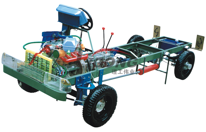 本品選用透明有機(jī)玻璃制作,內(nèi)中部件均以硬質(zhì)塑料料加工,用 螺絲固定在金屬高溫烘漆而成的車架上。各總成部分都以壓模成形加 工,代替過去膠粘合的方法,使產(chǎn)品在強(qiáng)度上有很大提高。發(fā)動(dòng)機(jī)總成用電機(jī)驅(qū)動(dòng),在油門處設(shè)有調(diào)速裝置,能演示發(fā)動(dòng)機(jī)轉(zhuǎn)速高低。離合器分離明顯,操縱靈活,離合器外殼整體壓模而成,變速箱和各檔齒輪用各種顏色表示,換檔靈活,手制動(dòng)美觀。后橋外形壓模而成,內(nèi)中主減速、差速轉(zhuǎn)動(dòng)自如,輪轂剎蹄壓模成型,剎蹄可調(diào)節(jié),前橋輪鼓可調(diào)整,轉(zhuǎn)向裝置以及電瓶、油箱、水箱,制動(dòng)管路分布清楚一目了然。電路采用對插件前后分布,燈架、風(fēng)窗、儀表板、后燈架用透明有機(jī)玻璃壓模成整體美觀逼真。