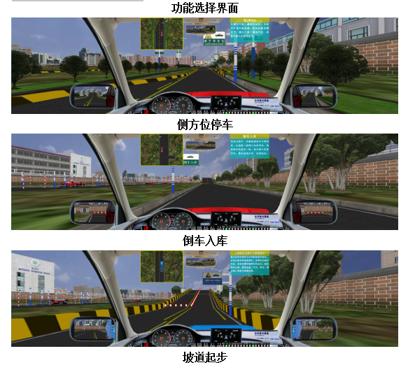 4.1軟件功能: 新版汽車駕駛模擬器軟件符合“公安部123號令”考評規(guī)則。小車(科目二)場地5項,分別為:倒車入庫、坡道定點停車和起步、側方停車、曲線行駛、直角轉彎;大車(科目二)場地16項,分別為:樁考、坡道定點停車和起步、側方停車、通過單邊橋、曲線行駛、直角轉彎、通過限寬門、通過連續(xù)障礙、起伏路行駛、窄路掉頭、模擬高速公路、連續(xù)急彎山區(qū)路、隧道、雨天、霧天濕滑路、緊急情況處置。新版汽車駕駛模擬器軟件道路駕駛技能考試(科目三)內容包括:上車準備(系安全帶)、起步、直線行駛、加減擋位操作、變更車道、靠邊停車、直行通過路口、路口左轉彎、路口右轉彎、通過人行橫道線、通過學校區(qū)域、通過公共汽車站、會車、超車、掉頭、夜間行駛等訓練考試項目。產品完全符合“中華人民共和國公安部令 第 123 號令”及教育部新的國家機動車駕駛員訓練大綱要求。本汽車駕駛模擬器分為單臺模擬駕駛及與主控臺聯(lián)網模擬駕駛兩款;具有自主知識產權。是目前市場上功能*全*新的汽車駕駛模擬器軟件。