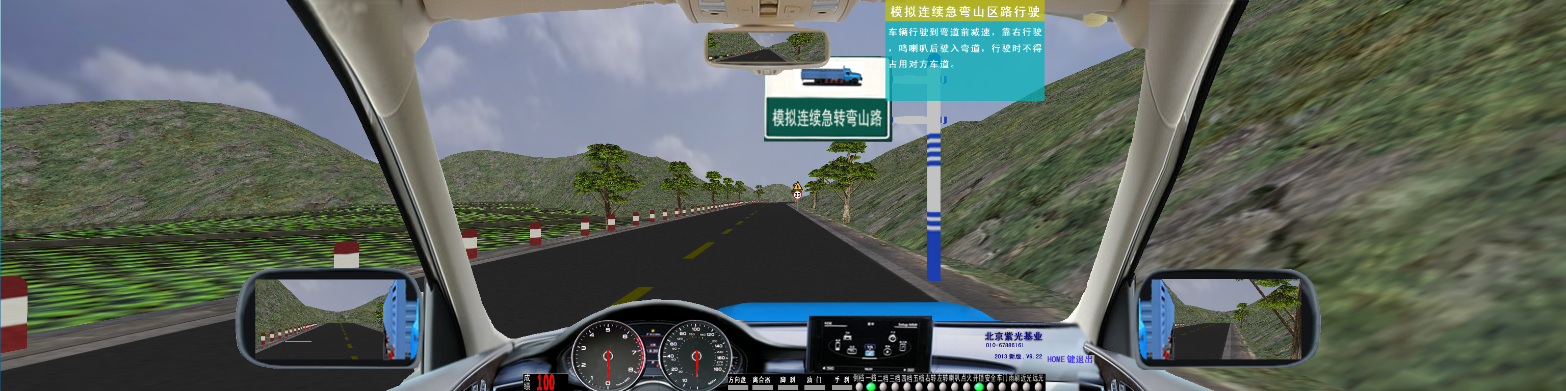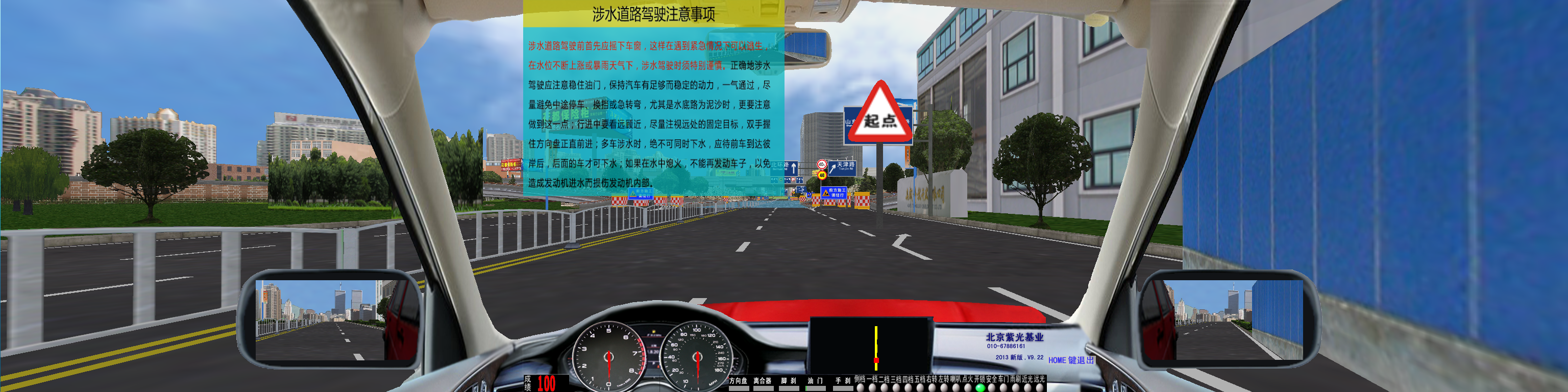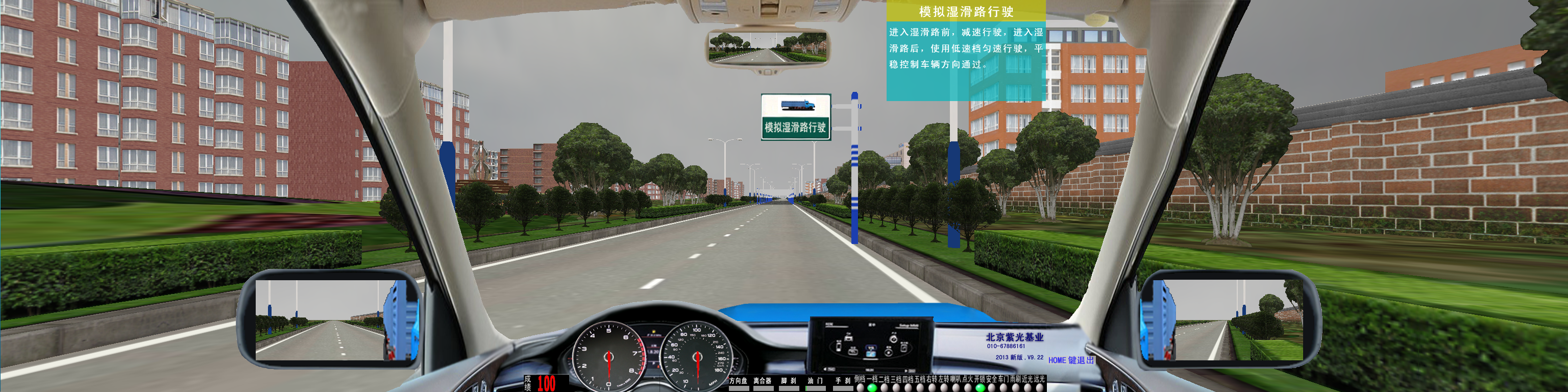 軟件主界面:啟動(dòng)畫(huà)面后,界面下方同時(shí)顯示:油門(mén)、剎車(chē)、轉(zhuǎn)向、離合器深淺進(jìn)度均有顯示。視景120度全新廣角寬頻駕駛模擬,界面顯示各項(xiàng)指示燈、文字提示框、檔位位置、訓(xùn)練成績(jī),后視鏡(左、右、中)后視鏡可調(diào)節(jié)、訓(xùn)練線路圖均有顯示。 |