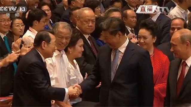 《勝利與和平》文藝晚會(huì)現(xiàn)場(chǎng),習(xí)近平主席和謝國(guó)民董事長(zhǎng)親切握手