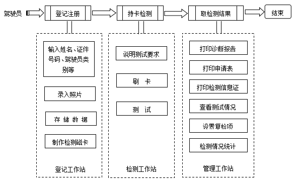 駕駛適性檢測系統(tǒng)的使用包括登記工作站、檢測工作站和管理工作站的使用及系統(tǒng)的維護等。完整的駕駛員檢測流程如下: