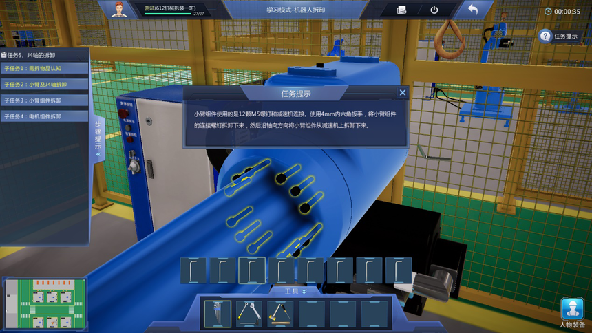 4、學習模式教學實訓任務豐富:機器人拆裝作業(yè)準備虛擬仿真實訓項目包含拆裝作業(yè)防護準備、機器人拆裝工具認知、機器人拆卸作業(yè)準備等至少3個教學實訓任務;機器人本體拆卸虛擬仿真實訓項目包含機器人整體拆卸、機器人J6軸到J1軸的分步拆卸、諧波減速機的認知、RV減速機的認知等至少9個教學實訓任務;機器人本體安裝虛擬仿真實訓項目包含機器人整體安裝、機器人J1軸到J6軸的分步安裝、機器人注油、軸承的認知、軸的初步認知等至少少10個教學實訓任務。機器人初步調(diào)試項目包含調(diào)試前準備、機器人開機、機器人關機、機器人基礎調(diào)試、機器人精度檢測等至少5個教學實訓任務。