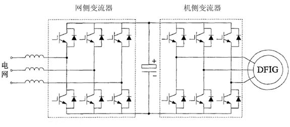 變流器柜含雙饋變流器主回路和控制系統(tǒng)。變流器柜的主回路及控制回路構(gòu)成了雙饋變流器,雙饋變流器主要由機側(cè)控制器及網(wǎng)側(cè)控制器兩部分組成。