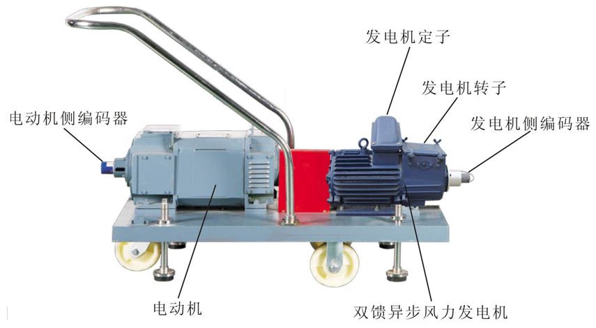 發(fā)電機組由直流電動機、雙饋異步風(fēng)力發(fā)電機、轉(zhuǎn)速傳感器、機組固定底盤及配套件等構(gòu)成。