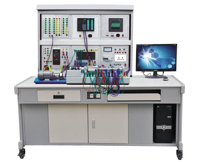 實(shí)訓(xùn)裝置由控制屏、實(shí)訓(xùn)桌、主機(jī)實(shí)訓(xùn)組件、實(shí)訓(xùn)模塊、變頻器模塊、觸摸屏模塊、交流電機(jī)、電機(jī)導(dǎo)軌、測(cè)速機(jī)構(gòu)等組成。
