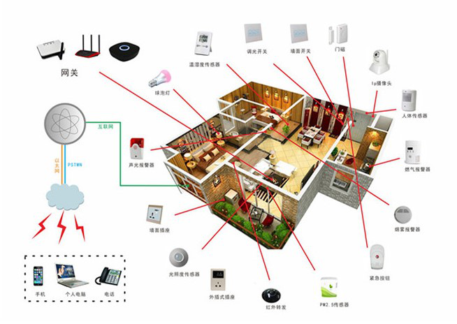 4、安防系統(tǒng):門磁傳感器、煙霧傳感器、聲光報警器、攝像頭等組合成家里的安全監(jiān)控系統(tǒng),預(yù)防安全隱患和及時報警處理?;赪iFi無線網(wǎng)絡(luò)或是有線網(wǎng)絡(luò)的遠(yuǎn)程視頻監(jiān)控、語音對講、視頻通話等功能。傳感器實時監(jiān)控室內(nèi)各種環(huán)境信息,一旦有異常情況發(fā)生,自動生成報警信號。