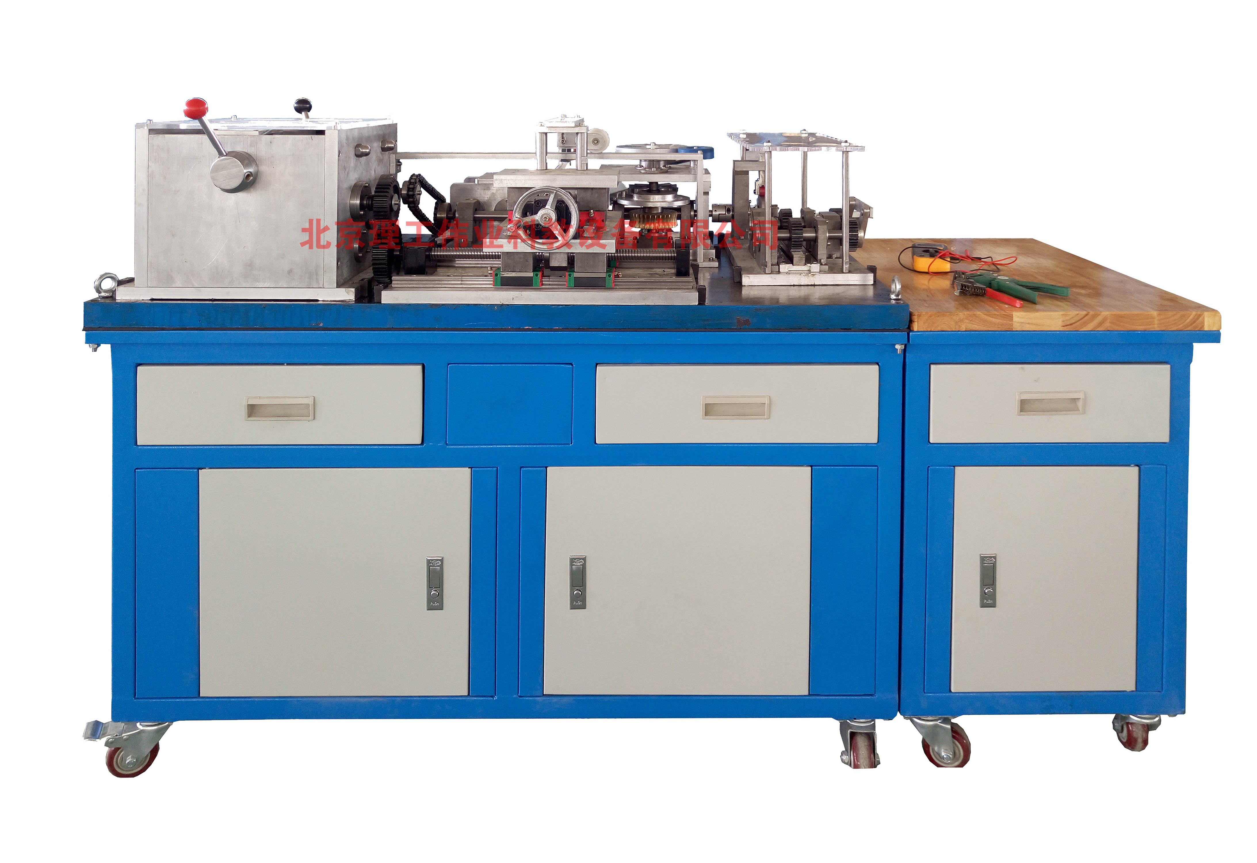 LG-JXZT01A型 機械裝調(diào)技術綜合實訓裝置主要由多種機械模塊組成,各個模塊可獨立訓練,也可綜合訓練。模塊包括(動力源、齒輪箱、十字滑臺、沖壓回轉(zhuǎn)工作臺、二級變速器、離合器、摩擦輪機構、曲柄及凸輪組合機構等)。涉及各種機械設備裝配中的一些比較典型的技能點和知識點。比如:帶、鏈等傳動機構的裝配與調(diào)整、齒輪箱的裝配、沖壓設備的裝配、軸承的裝配與調(diào)整(深溝球軸承、角接觸軸承、圓錐滾子軸承、推力球軸承)、圓柱圓錐齒輪的裝配與調(diào)整、蝸輪蝸桿副的裝配、齒條的裝配、曲柄及凸輪副的裝配與調(diào)整、槽輪及摩擦輪的裝配、摩擦輪與滾道裝配、滾珠絲桿副裝配、直線導軌的裝配與調(diào)整、相關平行度及垂直度的調(diào)整與檢測等。