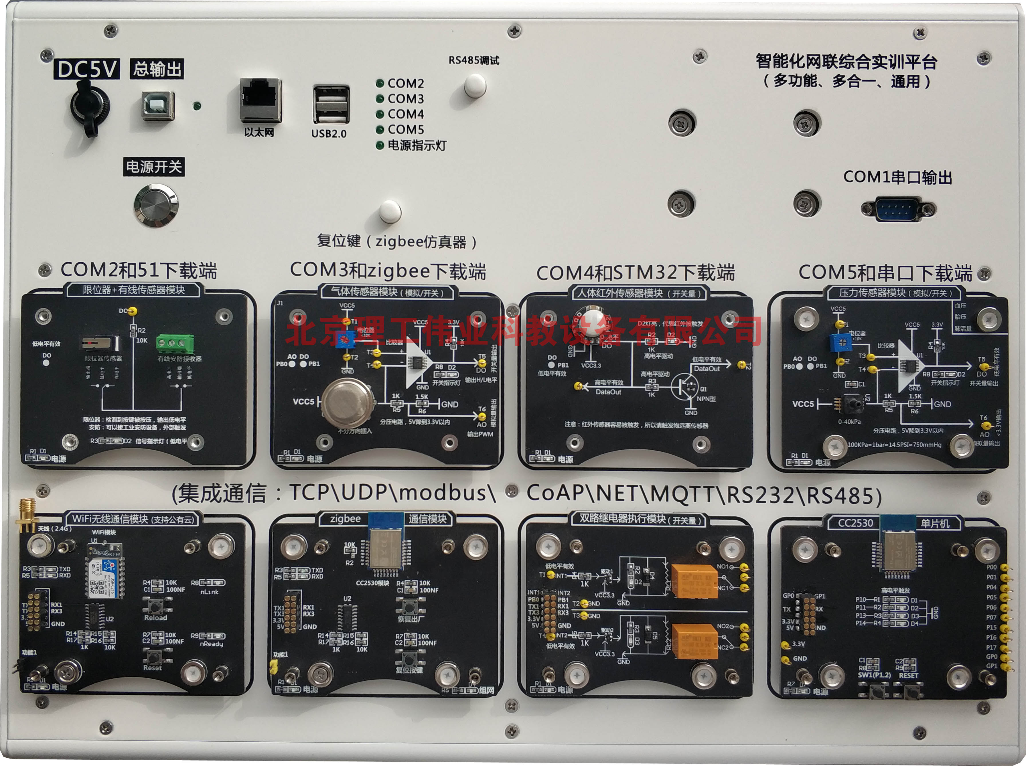 1.采用一體式供電結(jié)構(gòu),具備磁吸連接接口,提供5V供電接口、雙路USB接口、J-link下載接口、CC-debug下載接口、RS232/485串口接口,內(nèi)置USB HUB, 通過 1 路 USB HUB,拓展8路USB 接口,實(shí)驗(yàn)平臺具備8個通用實(shí)驗(yàn)?zāi)K插槽,集成防短路設(shè)計(jì),提供了主板復(fù)位鍵以及ZigBee仿真器復(fù)位鍵,每個COM端對應(yīng)一盞指示燈(藍(lán)色),COM1-COM4模塊正常工作時,指示燈閃爍,另外配有主板運(yùn)行指示燈(藍(lán)色),實(shí)驗(yàn)平臺正常運(yùn)行時,指示燈常亮;