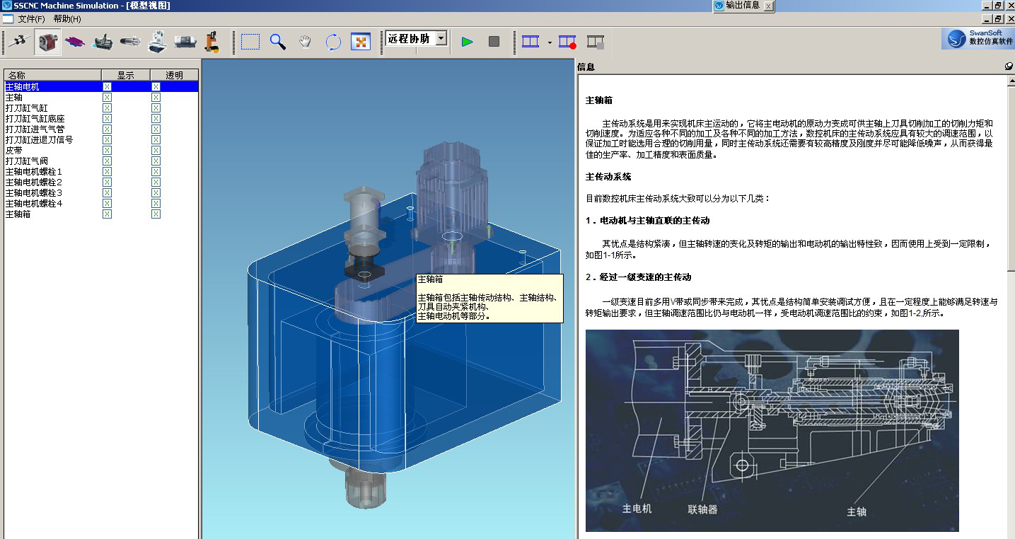 (4)軟件具有平床身、斜床身、加工中心、減速器、齒輪泵的結(jié)構(gòu)拆裝模塊:包括刀庫、主軸系統(tǒng)、十字滑臺、X軸伺服進給、Y軸伺服進給、Z軸伺服進給、加工中心整體、拖板結(jié)構(gòu)、主軸箱、刀架、平床身Z伺服進給、平床身整體、斜床身伺服進給、斜床身拖板結(jié)構(gòu)、斜床身刀架、斜床身尾座、斜床身整體、減速器整體、視孔蓋、輸出軸、輸入軸、齒輪泵整體部分。拆裝具有示教拆裝和手動拆裝功能,同時提供快速組件裝配和爆炸圖的功能,可以一步裝配好組件也可以從無到有組裝組件。拆裝過程提供工藝提示。