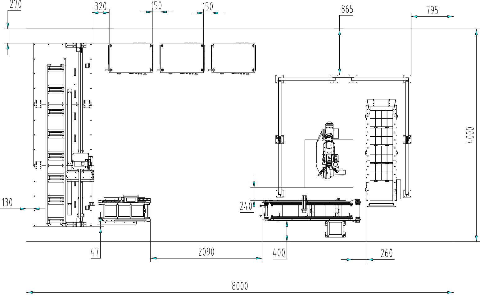 本設(shè)備共包括:工業(yè)機(jī)器人及控制柜、PLC 控制柜、托盤流水線、物品盒擺放流水線、AGV 小車等。比賽所用場(chǎng)地為 4m×8m,如圖 2-1 所示為裝備之間的大致布局,現(xiàn)場(chǎng)安裝時(shí)并不一定嚴(yán)格按照?qǐng)D中所標(biāo)尺寸安裝,允許有所變動(dòng)。在安裝時(shí)需要注意以下事項(xiàng):