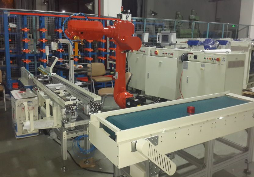 本系統(tǒng)安裝于托盤流水線中,當(dāng)托盤貨物到視覺檢測(cè)工位時(shí), X-SIGHT 機(jī)器視覺系統(tǒng)對(duì)托盤內(nèi)的貨物進(jìn)行視覺識(shí)別,并把識(shí)別的位置,形狀等特征數(shù)據(jù)給到中央控制器和六關(guān)節(jié)機(jī)器人,由機(jī)械人根據(jù)目標(biāo)存放位置執(zhí)行相應(yīng)的動(dòng)作。