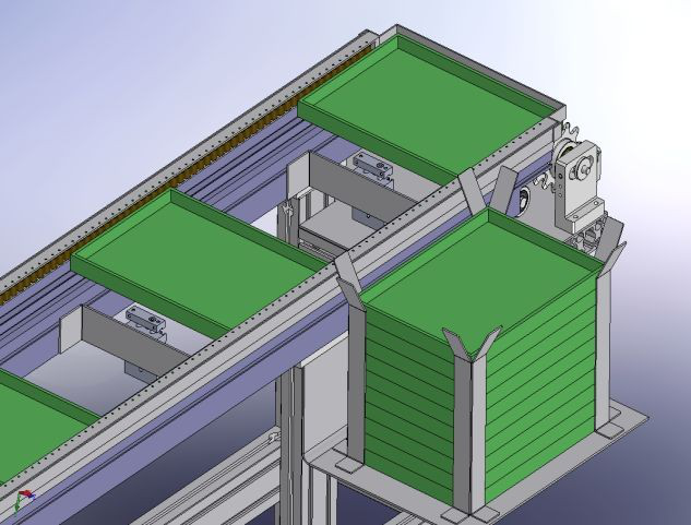 物品盒流水線采用板鏈結(jié)構(gòu),負(fù)責(zé)成品物品盒的裝箱及傳送,為5工位流水線,裝在3個(gè)物品盒(占用3個(gè)工位)。