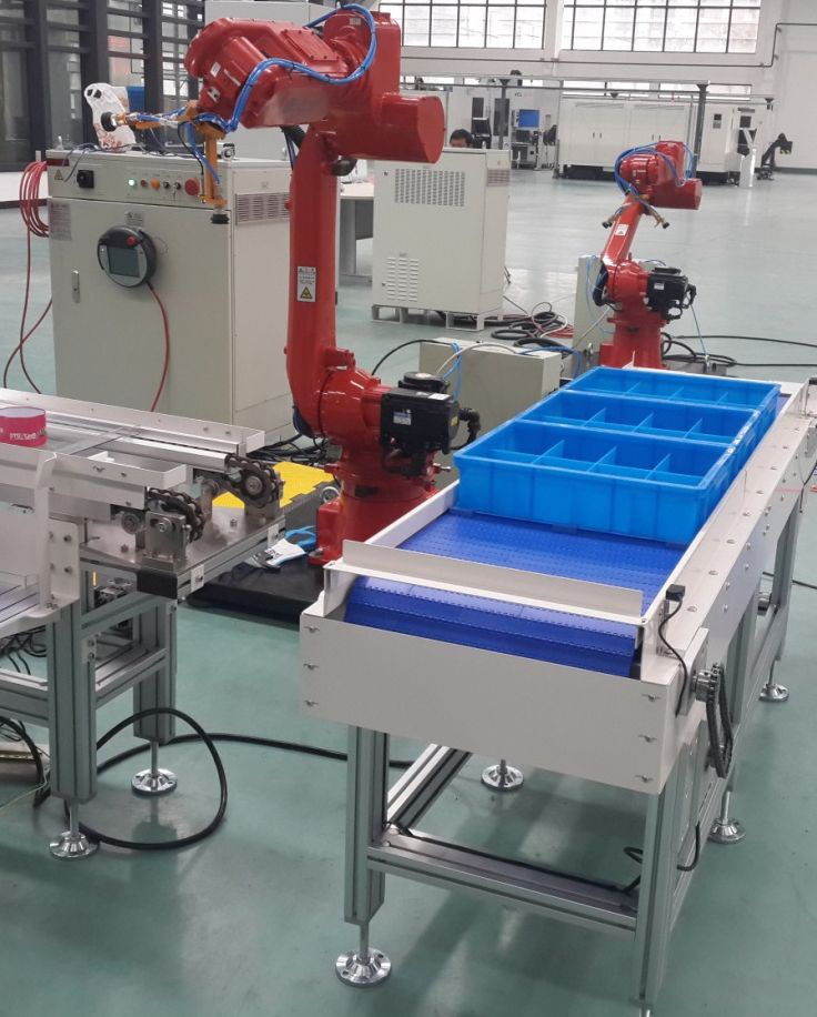(6) 六自由度工業(yè)機(jī)器人系統(tǒng),根據(jù)主控系統(tǒng) PLC 發(fā)送的數(shù)據(jù),對(duì)托盤流水線上的托盤上的物品進(jìn)行分揀,放置于物品盒流水線上的指定物品盒中,同時(shí)把空托盤放置于空托盤庫(kù)中。