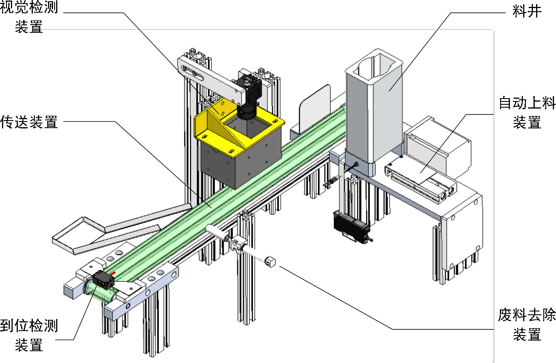 多功能料井為鋁合金材質(zhì),可兼容正方形、長(zhǎng)方形和圓形三種形狀的物料塊以固定的姿態(tài)到達(dá)料井底部,料井底部設(shè)置有反射型光纖傳感器,當(dāng)傳感器檢測(cè)到有物料落下時(shí),觸發(fā)自動(dòng)上料裝置,雙軸氣缸將物料推送到傳送裝置上。傳送裝置上電機(jī)配合精密減速器驅(qū)動(dòng)傳送帶模擬真實(shí)工廠的流水線,在流水線的中間設(shè)置有視覺檢測(cè)裝置,檢測(cè)合格產(chǎn)品可以到達(dá)傳送帶的末端,不合格產(chǎn)品作為廢料,由廢料去除裝置推出傳送帶。在傳送帶末端配有精密傳感器感應(yīng)產(chǎn)品是否到位。