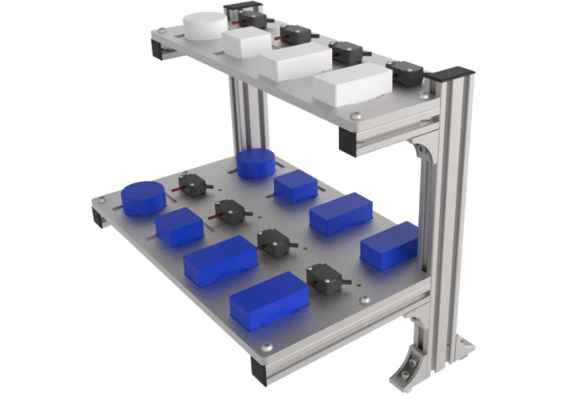 2、智能料庫(kù)模塊智能料庫(kù)分為上下兩層,每層設(shè)置 4 個(gè)工位。每個(gè)工位都可以放置正方形、長(zhǎng)方形或圓形的物料。同時(shí),每個(gè)工位安裝有傳感檢測(cè)裝置,可自行判斷此工位是否有物料。