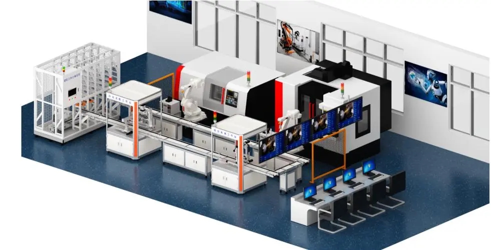 數(shù)控車床加工中心單元用于整個工件的軸類部份的加工,采用自動門、自動裝夾、四工位自動刀架、并有工件冷卻加工系統(tǒng),現(xiàn)實機(jī)加工件無人化DNC自動加工,配置伺服電機(jī)、工業(yè)級數(shù)控系統(tǒng)。