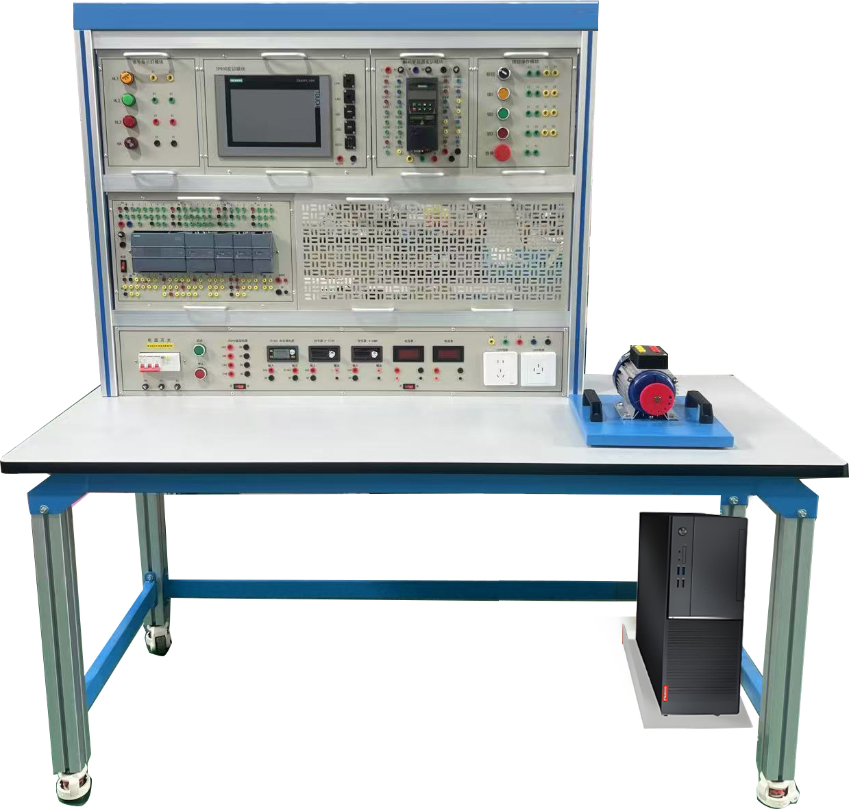 一 、技術(shù)指標(biāo) 1、采用鋁合金框架與網(wǎng)孔板組合成立式實訓(xùn)展板結(jié)構(gòu)形式,有腳輪。 2、實訓(xùn)臺尺寸為 1800 mm(高)800 mm(寬)465 mm(底座深)。 3、實訓(xùn)臺上安裝西門子...