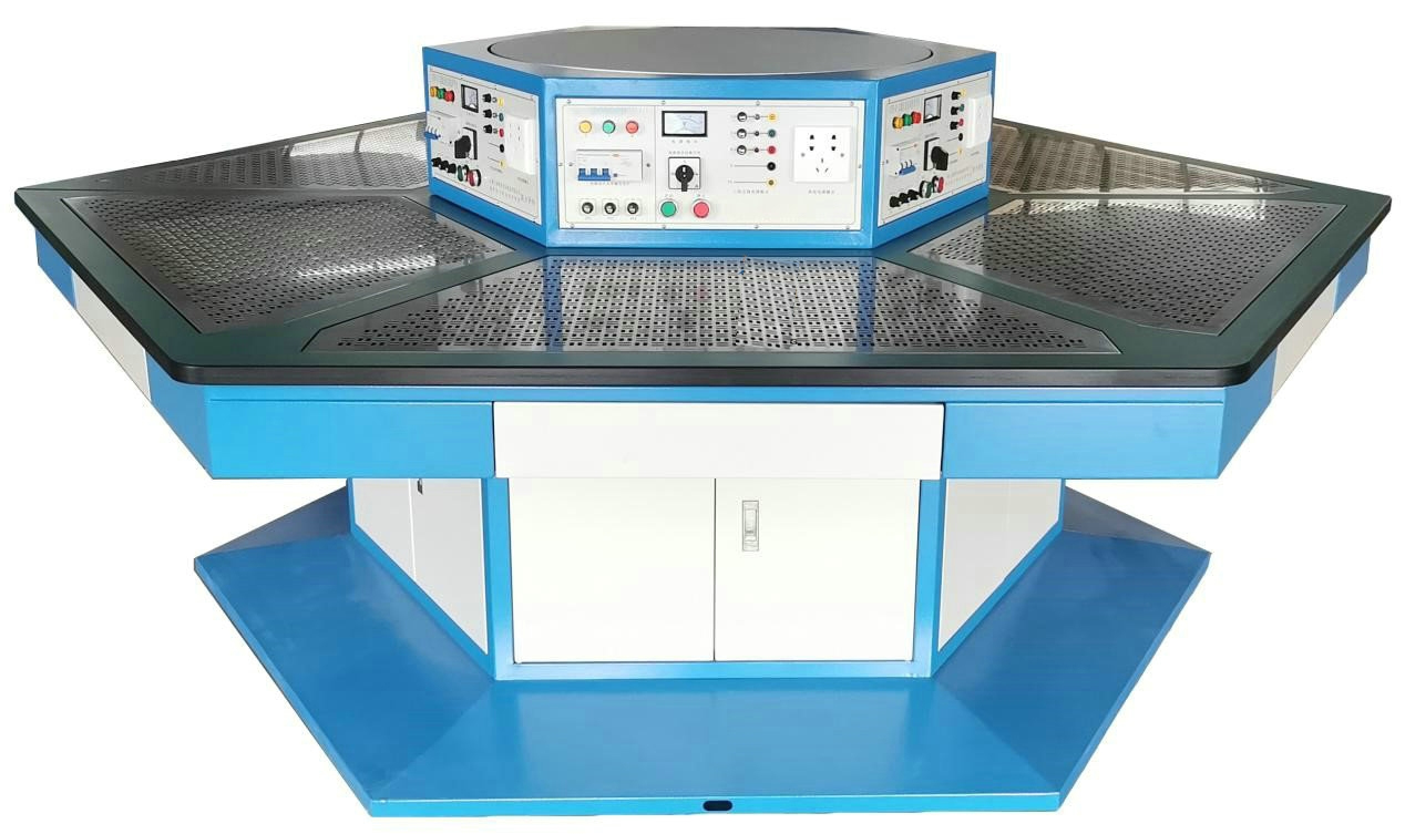 2、六邊形電源控制屏:電源控制屏采用六邊形結(jié)構(gòu),與工作臺(tái)相對(duì)應(yīng)??蚣懿捎脙?yōu)質(zhì)鞍鋼盒裝鋼板,經(jīng)過(guò)機(jī)械加工成型,外表面噴涂彩色環(huán)氧聚塑。六個(gè)作業(yè)面配置有實(shí)訓(xùn)電源及主機(jī)控制系統(tǒng),控制面板具有漏電保護(hù)、短路保護(hù)功能。電源控制屏頂面采用10mm厚的鋁框包邊,內(nèi)置有直徑為850mm的多角度公共操作平臺(tái),公共操作平臺(tái)能360°旋轉(zhuǎn),能做120°定位,平臺(tái)頂板采用10mm厚的鋁板加工成型,能載重約60Kg的典型工作任務(wù)。