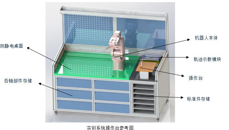 2、平臺(tái)分為兩部分:一部分為機(jī)器人本體拆裝實(shí)訓(xùn)區(qū)域,一部分為拆裝好定位及精度調(diào)試區(qū)域。