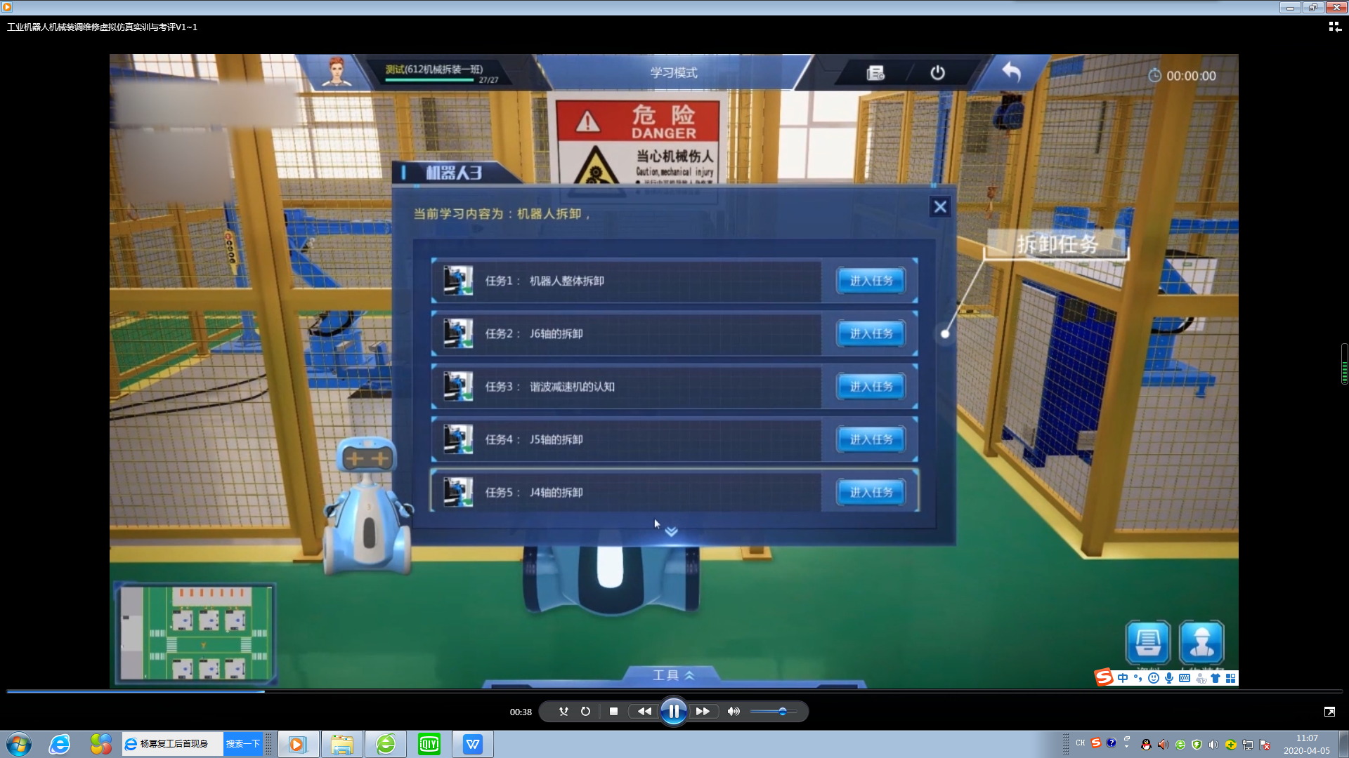4、學(xué)習(xí)模式教學(xué)實(shí)訓(xùn)任務(wù)豐富:機(jī)器人拆裝作業(yè)準(zhǔn)備虛擬仿真實(shí)訓(xùn)項(xiàng)目包含拆裝作業(yè)防護(hù)準(zhǔn)備、機(jī)器人拆裝工具認(rèn)知、機(jī)器人拆卸作業(yè)準(zhǔn)備等至少3個(gè)教學(xué)實(shí)訓(xùn)任務(wù);機(jī)器人本體拆卸虛擬仿真實(shí)訓(xùn)項(xiàng)目包含機(jī)器人整體拆卸、機(jī)器人J6軸到J1軸的分步拆卸、諧波減速機(jī)的認(rèn)知、RV減速機(jī)的認(rèn)知等至少9個(gè)教學(xué)實(shí)訓(xùn)任務(wù);機(jī)器人本體安裝虛擬仿真實(shí)訓(xùn)項(xiàng)目包含機(jī)器人整體安裝、機(jī)器人J1軸到J6軸的分步安裝、機(jī)器人注油、軸承的認(rèn)知、軸的初步認(rèn)知等至少少10個(gè)教學(xué)實(shí)訓(xùn)任務(wù)。機(jī)器人初步調(diào)試項(xiàng)目包含調(diào)試前準(zhǔn)備、機(jī)器人開機(jī)、機(jī)器人關(guān)機(jī)、機(jī)器人基礎(chǔ)調(diào)試、機(jī)器人精度檢測(cè)等至少5個(gè)教學(xué)實(shí)訓(xùn)任務(wù)。