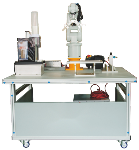 該裝置采用鋁木結(jié)構(gòu)試訓(xùn)臺,由實訓(xùn)桌、飲水機(自動售賣機)、取杯器、工業(yè)機器人(帶復(fù)合手爪),底座(支架)等幾個部分組成,利用工業(yè)機器人完成茶藝流程一系列的動作。該設(shè)備圍繞工業(yè)機器人展開內(nèi)容,從通訊、機械、電氣三方面突出顯示其在服務(wù)業(yè)中的運用,為學(xué)習(xí)自動化提供全面教學(xué)便利。