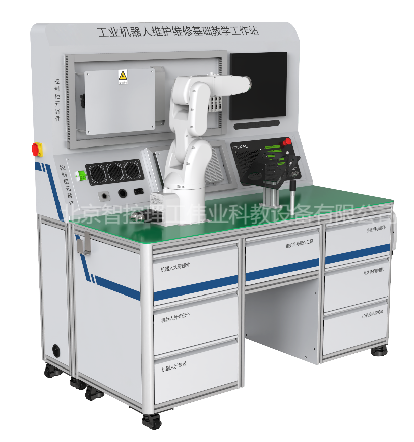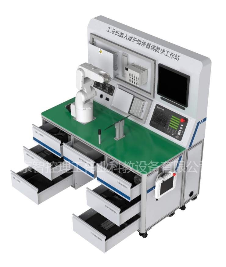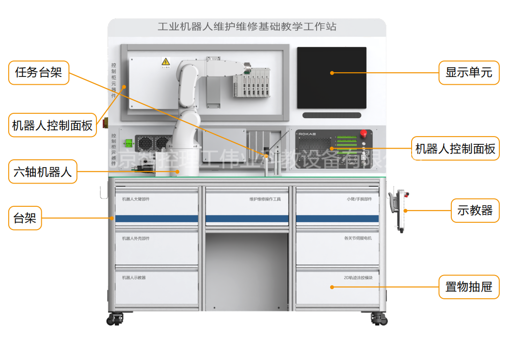 工業(yè)機(jī)器人維護(hù)維修基礎(chǔ)教學(xué)工作站,以工業(yè)機(jī)器人本體及其控制系統(tǒng)最常見維護(hù)維修操作為核心,通過對典型故障的診斷和排除,按照規(guī)范步驟完成對工業(yè)機(jī)器人本體的拆裝過程,并根據(jù)圖紙要求搭建控制系統(tǒng)并接線,由零件級深入了解工業(yè)機(jī)器人的構(gòu)成形式和運(yùn)動方式,掌握基礎(chǔ)維護(hù)維修技能。工作站配套了與生產(chǎn)廠家完全相同的工裝、工具,讓學(xué)生可以在教學(xué)環(huán)境中充分體驗(yàn)高精度機(jī)電設(shè)備的生產(chǎn)工藝要求,確實(shí)掌握維護(hù)維修技能。