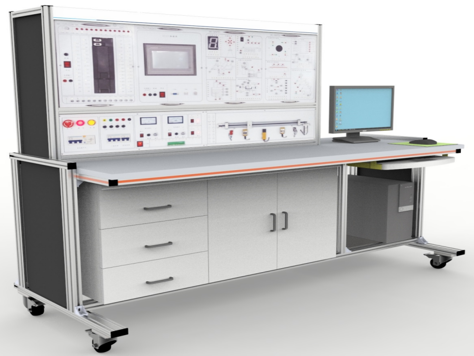 2、臺(tái)架構(gòu)成:實(shí)訓(xùn)臺(tái)采用工業(yè)鋁型材加工。桌面下面放置儲(chǔ)物柜,左側(cè)有3層抽屜,用于存放工具以及實(shí)訓(xùn)資料,右側(cè)為雙拉門式設(shè)計(jì),可以放置實(shí)訓(xùn)掛箱。底部裝有四個(gè)帶鎖止功能的萬(wàn)向輪。柜體后下側(cè)留有電源輸入線。預(yù)留計(jì)算機(jī)放置位置。