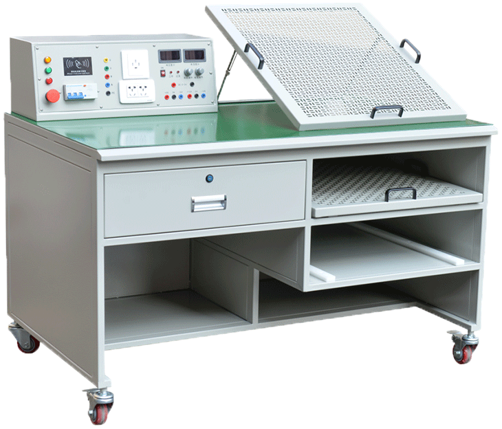 實訓(xùn)裝置由電源部分、實操部分、儲物部分組成。桌面設(shè)計高度750mm符合人體工程學(xué),滿足絕大部分使用者的使用體驗,底部裝有4個萬向福馬輪,方便移動和固定。