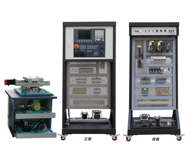 2、機床實訓柜采用鐵質亞光密紋噴塑結構,正面裝有數控系統和操作面板,背面為機床電氣柜,柜內器件布局與實際機床廠的模式一致。電氣柜內的電氣安裝板為不銹鋼網孔板,上面裝有變頻器、伺服驅動器、交流接觸器、繼電器、保險絲座、斷路器、開關電源、接線端子排和走線槽等;電氣柜底部還設有變壓器和接地端子等。