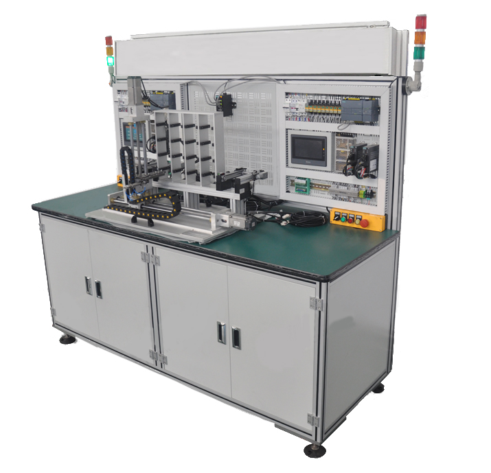 LGJ-CC01型 光機電一體化小型立體倉儲實訓臺采用鋁合金結構框架,帶有腳輪和腳杯,側面安裝1.2mm厚鈑金封板;采用中間放置立體倉庫機構,兩側放置電氣控制部份結構設計,控制電氣接口與立體倉庫間采用標準連接器進行連接對插,可同時容納兩組學生進行電氣調試;單個工作臺外形大體尺寸為:約長2000*寬800*高1600mm;電氣面板采用立式網孔板安裝,配套DIN導軌電氣導軌。