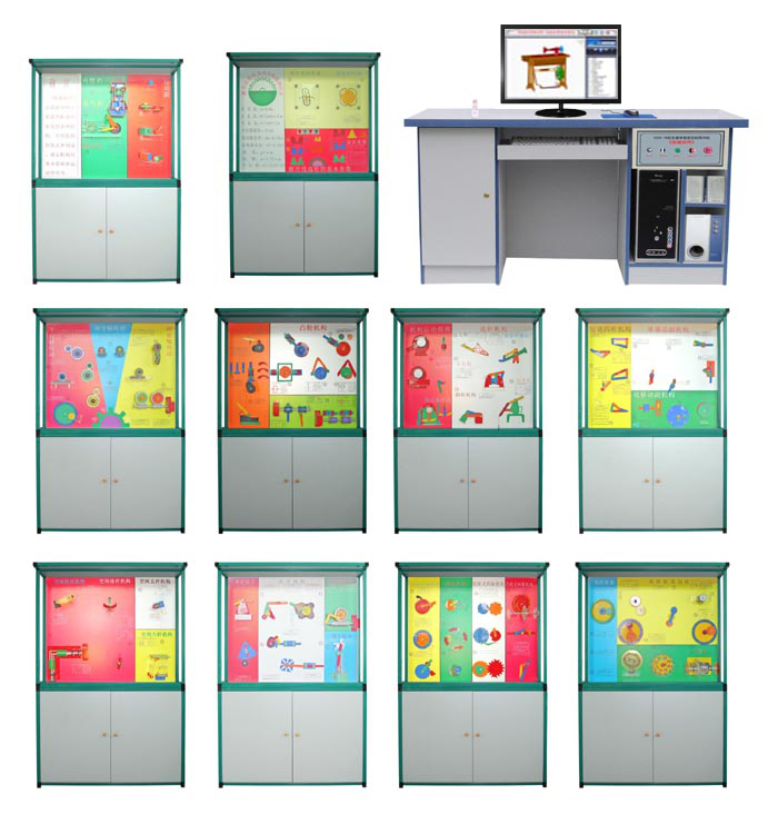 LG-N02型 多媒體智能控制《機(jī)械原理》陳列柜是根據(jù)大、中專院校、技校、職業(yè)學(xué)校的機(jī)械原理教學(xué)大綱而設(shè)計(jì)的一套電化多媒體教學(xué)設(shè)備。機(jī)械原理陳列柜共分十個(gè)柜和一個(gè)電腦控制臺(tái),進(jìn)行多媒體聲控同步解說演示。由PC機(jī)電腦控制順序或任選運(yùn)行每個(gè)柜模型動(dòng)作,同時(shí)電腦播放圖像或三維動(dòng)畫同步模型動(dòng)作。