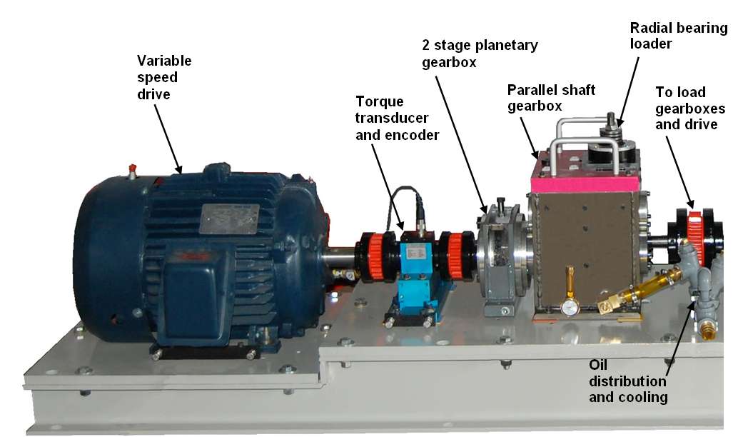 - 兩個并??列的平行軸齒輪箱與更大的負(fù)載容量比試驗變速箱;一個齒輪箱具有兩個階段的增速器,一個變速箱有三個階段增速