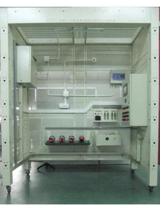 1、模擬房:整體以鋁合金型材、鋼制網(wǎng)孔板和木工板組成梯形基本外框架,更真實(shí)模擬施工現(xiàn)場,更換方便,可進(jìn)行電器的安裝與布線;模擬房正面一側(cè)立柱是電源控制系統(tǒng),帶有總電源控制、急停按鈕和多組漏電保護(hù),具有電源指示運(yùn)行指示和照明開關(guān),單獨(dú)提供220V、380作安裝實(shí)訓(xùn)時(shí)使用電動工具的供電電源。工業(yè)防水插座和38V碟插端子提供220V、380電源輸出用于實(shí)訓(xùn)調(diào)試運(yùn)行,模擬房內(nèi)部采用LED燈照明;