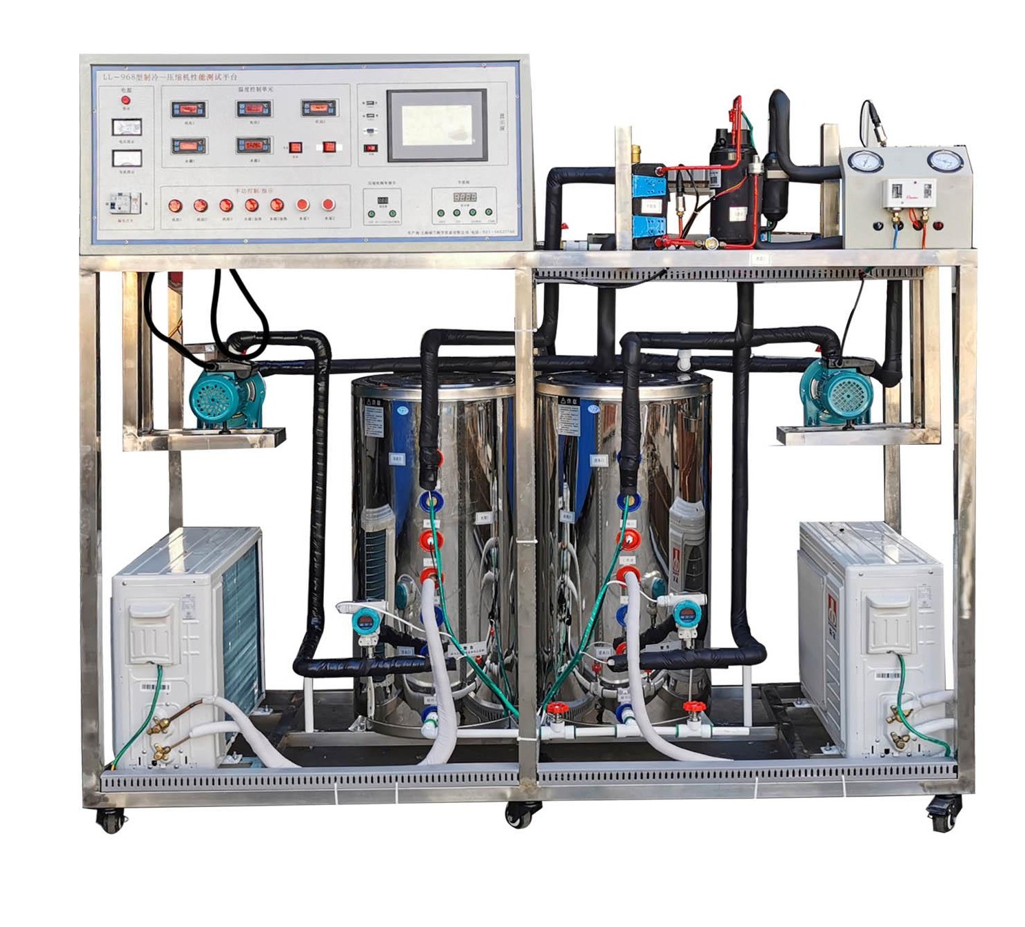 LGZL-RB01型 熱泵-壓縮機性能實驗系統(tǒng)采用熱平衡法測量熱泵與制冷壓縮機的性能。系統(tǒng)主要由制冷壓縮機、蒸發(fā)器、冷凝器、恒溫水箱和電子膨脹閥等組成。采用傳感器和檢測儀表采集蒸汽壓縮式制冷循環(huán)過程中的溫度、壓力、流量、壓縮機功率、電流、頻率等狀態(tài)參數(shù),經(jīng)自行研制的數(shù)據(jù)采集板卡連接到計算機,基于面向對象技術開發(fā)的具有實時性高,界面設計人性化等特點的測控軟件實現(xiàn)熱力循環(huán)過程實時動態(tài)顯示、性能參數(shù)測試和計算,構成具有檢測、分析、記錄、測試、繪圖等多功能一體化的熱泵-壓縮機性能實驗系統(tǒng)?;诨A型機組,增加如下內(nèi)容:學生設計型與創(chuàng)新型實驗。