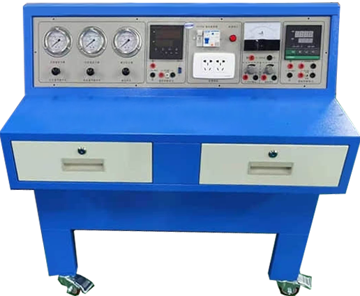 (1)鋼質(zhì)、臺面不小于1500×700mm,后側(cè)置高于臺面300mm左右的斜面,便于布置各種輔助儀表等設(shè)備,包括0~0.1MPa壓力表,4~20mA電流表,0.7MPa的氣源壓力表,24VDC100W模塊。臺內(nèi)置模塊的抽屜,方便替換和放置。4個腳安裝帶制動的萬向滑輪,便于實驗臺移動。