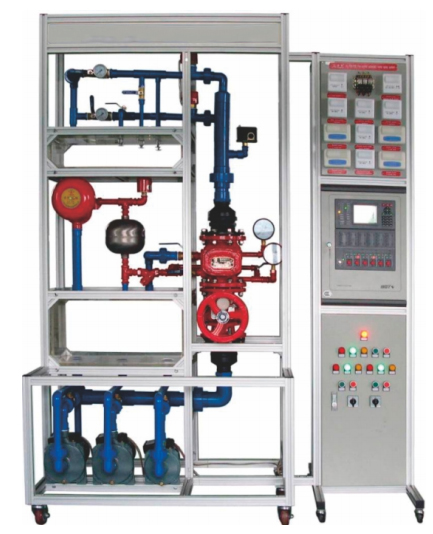 本裝置采用高級(jí)鋁型材框架開(kāi)放式結(jié)構(gòu)設(shè)計(jì),主要由濕式報(bào)警閥、信號(hào)閘閥、水力警鈴、水延遲器、各類(lèi)噴淋頭、增壓泵、恒壓泵、壓力開(kāi)關(guān)、水流指示器、壓力表、末端試水裝置、透明有機(jī)玻璃水箱、水泵控制箱、火災(zāi)報(bào)警控制器、聯(lián)動(dòng)控制模塊、基于BACnet總線(xiàn)網(wǎng)絡(luò)的DDC控制器、手閥及各類(lèi)水管等組成。