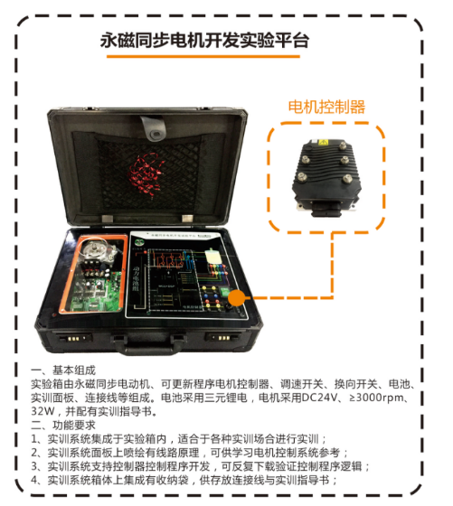 實(shí)驗(yàn)箱由永磁同步電動(dòng)機(jī)、可更新程序電機(jī)控制器、調(diào)速開關(guān)、換向開關(guān)、電池、實(shí)訓(xùn)面板、連接線等組成。電池采用三元鋰電,電機(jī)采用DC24V、≥3000rpm、32W。