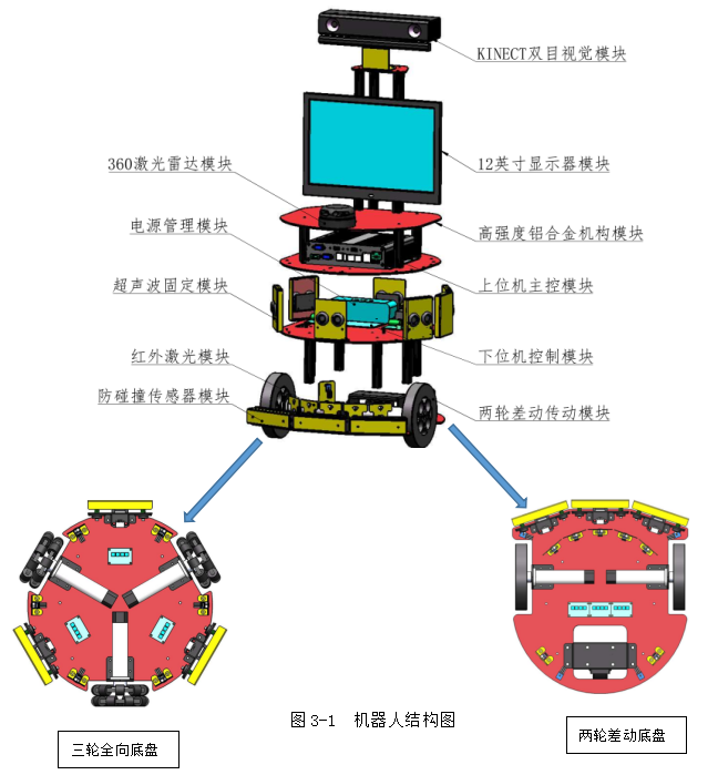 組成模塊: 1.嵌入式開發(fā)板:1塊; 2.直流伺服減速電機:3個,電機驅動模塊:2個; 3.超聲波傳感器:6個,碰撞傳感器:6個,防跌落傳感器:6個; 4.電池:鋰電池1塊,平衡充電器:1個; 5.深度相機:1臺,二維激光測距儀:1套; 6.I5控制器及顯示器1套; 7.機械結構套件 1套; 8.全向輪:3個,差動輪:2個; 9.結構:3+1層,鋁合金材料; 10.安裝工具:1套, 鋁合金箱:1個; 11.組合后尺寸:320mm*320mm*(500-1200mm高度可調)。 下層軟件功能: 1 機器人運動控制功能(速度控制,位置控制,軌跡控制); 2 機器人循跡功能; 3 機器人漫游功能; 4機器人防跌功能; 5 機器人防撞功能。 上層軟件功能: 6 機器人室內地圖構建功能; 7 機器人室內自主導航與規(guī)劃能; 8 機器人人體跟蹤功能; 9 機器人語意識別與對話功能; 10 機器人人體姿態(tài)識別功能; 11 機器人三維仿真功能; 12 機器人3D地圖構建功能。 |