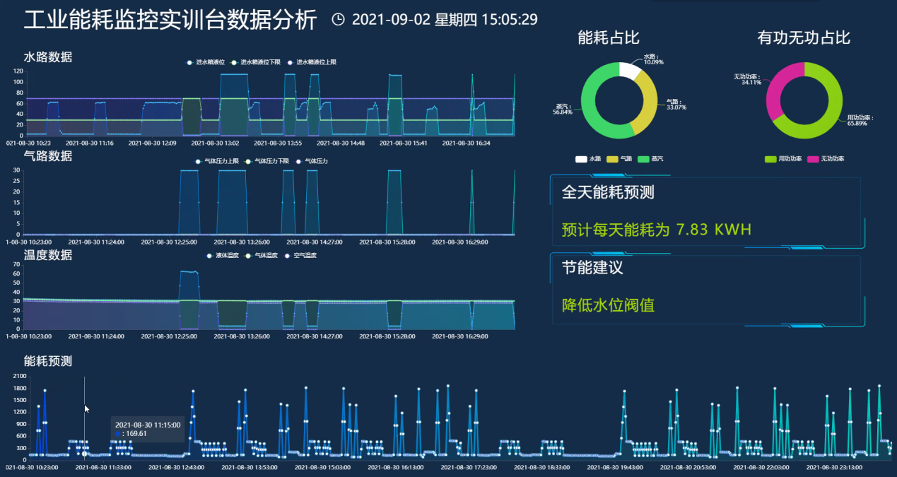 LGHL-04型 工業(yè)互聯(lián)能耗監(jiān)控實(shí)訓(xùn)臺以水、氣、電能耗監(jiān)測為背景,采用液位計、流量計、溫度變送器、壓力變送器、電磁閥、水泵、氣泵、電氣控制箱、水箱等裝置模擬工業(yè)場景下的水循環(huán)、氣循環(huán)、電能監(jiān)測常見的過程控制系統(tǒng)。其中水箱作為液體盛放和氣體導(dǎo)入的氣液混合容器,模擬化工行業(yè)常見的化工產(chǎn)品制備工藝場景。通過現(xiàn)場監(jiān)控裝置及傳輸模塊,將液位、流量、壓力、水溫、氣溫、電壓、電流、電量等過程控制參數(shù)進(jìn)行數(shù)據(jù)采集,傳輸?shù)侥茉垂芾砥脚_,達(dá)到工業(yè)水、電、氣等至少三種數(shù)據(jù)采集控制、數(shù)據(jù)傳輸、數(shù)據(jù)存儲、數(shù)據(jù)分析及可視化展示的目的。