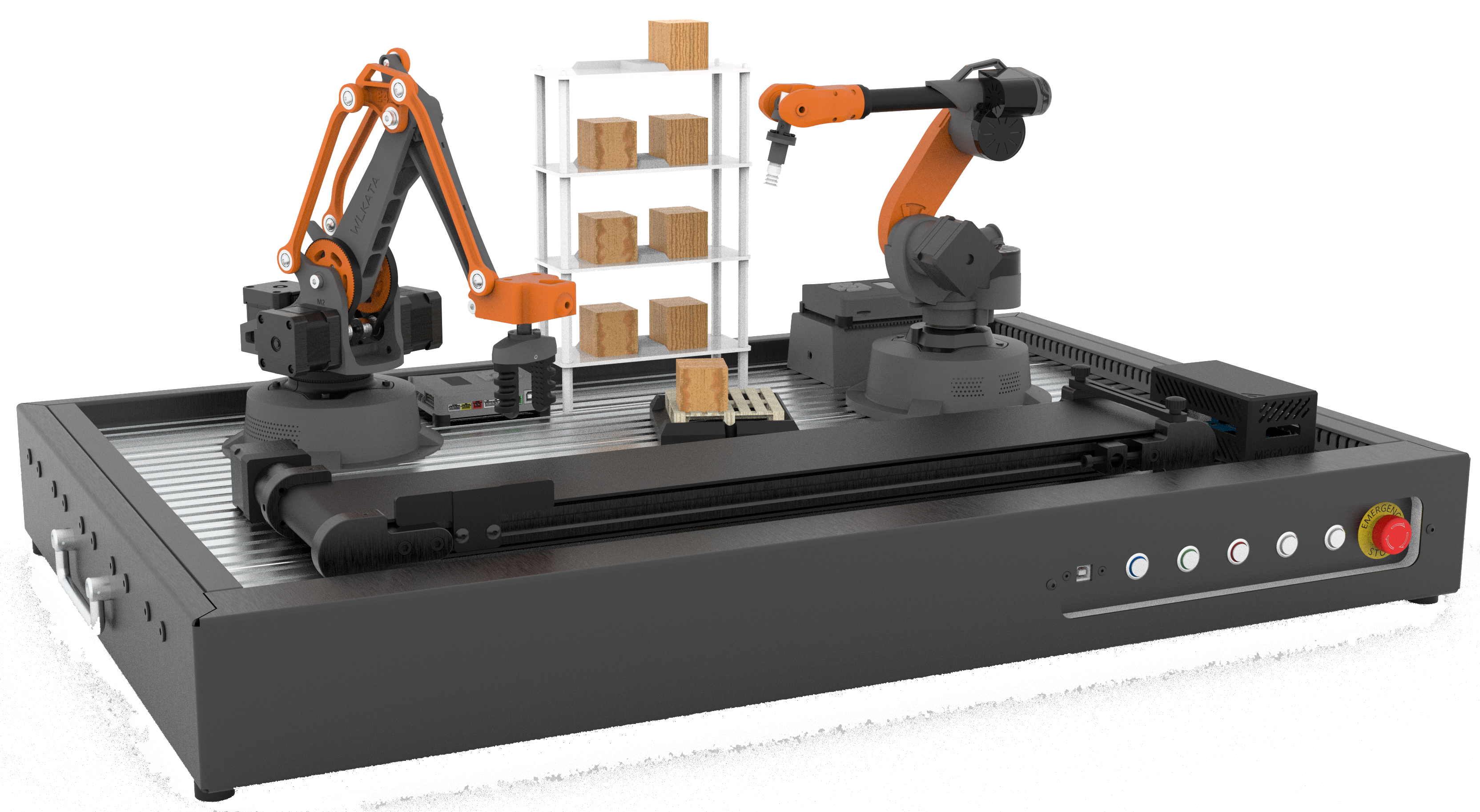 桌面六軸工業(yè)機(jī)器人*1、四軸桌面機(jī)器人*1、傳送帶套件*1、智能一體化底座*1、物流配件包*1