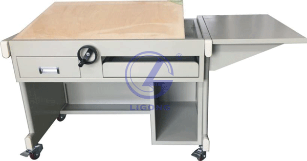 桌面可調(diào)節(jié)傾角、桌子側(cè)面折疊板翻開可放置儀器、工具,下面抽屜供放學(xué)習(xí)資料、工具書等。